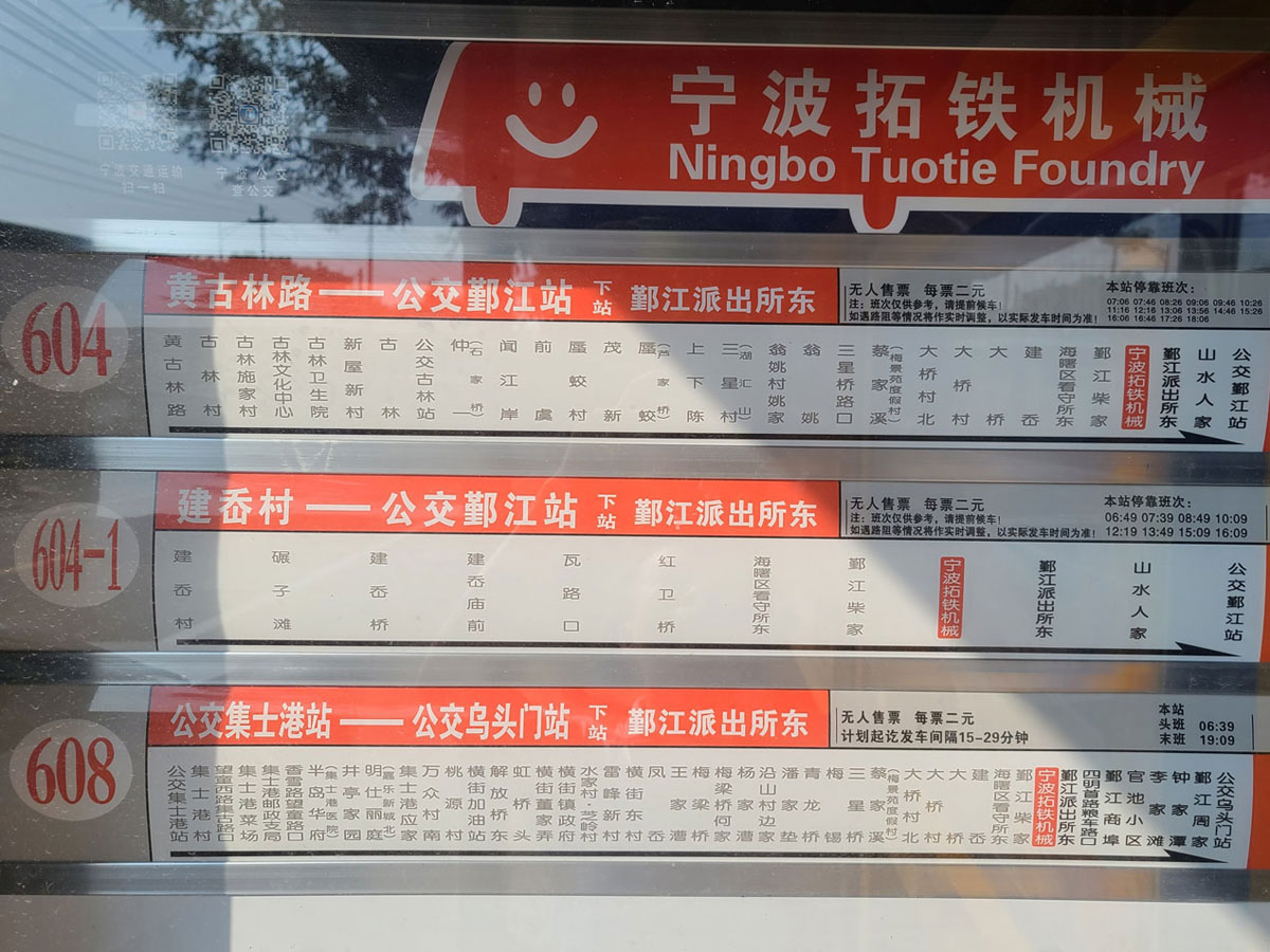 近期,位于宁波市海曙区鄞江镇大桥村的“星空体育全站_星空(中国)机械”公交车站投入运营,正式并入3条公交线路:604路、604-1路、608路。这将进一步为星空体育全站_星空(中国)广大员工及家属们的日常出行提供便利。
